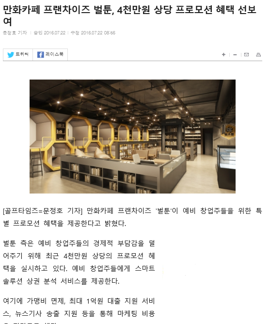 만화카페 프랜차이즈 벌툰, 4천만원 상당 프로모션 혜택 선보여 페이지 정보 작성자 벌툰 작성일16-07-22 11:48 조회562회 댓글0건 관련링크 http://www.thegolftimes.co.kr/news/articleView.html?idxno=25252 1967회 연결 이전글 다음글 목록 본문 . 댓글목록 등록된 댓글이 없습니다. 이전글 다음글 목록